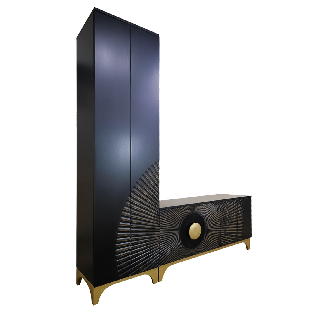 Размеры: Ш1880 (ширина шкафа 560 мм + ширина тумбы 1320 мм)×В2150 (высота тумбы - 650 мм) ×Г450 мм