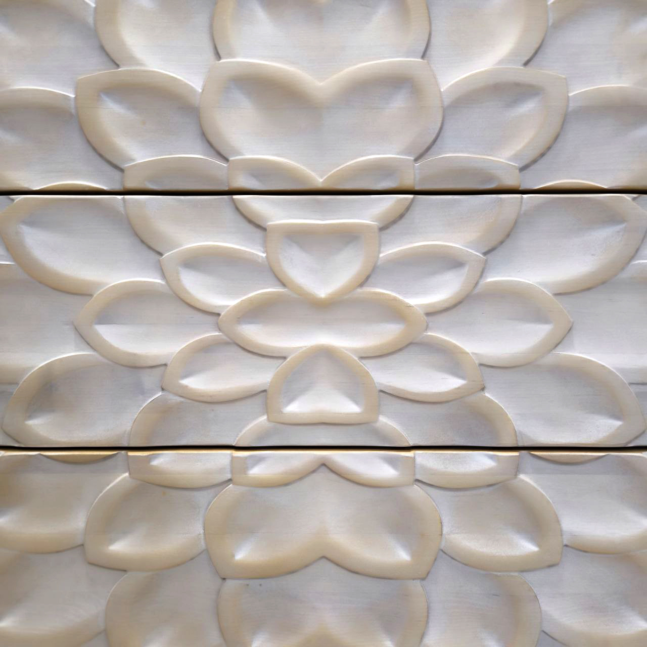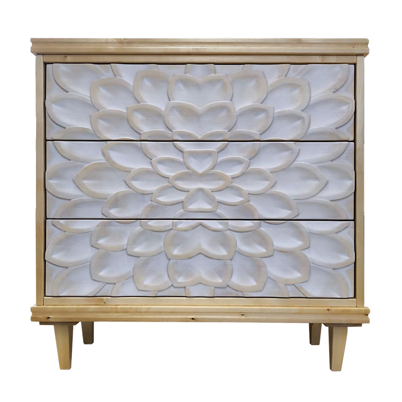 Комод MH_278 – это воплощение утонченного стиля и безупречного качества. Изготовленный из светлого массива березы, он обладает выразительной текстурой и теплым оттенком, создающим атмосферу уюта и спокойствия. Гладкая, тщательно обработанная поверхность подчеркивает природную красоту материала и делает комод приятным на ощупь. Три выдвижных ящика украшены изысканной резьбой, изображающей распустившиеся лепестки цветка. Эта объемная резьба, выполненная с невероятной точностью, создает игру света и тени, напоминая медленное раскрытие бутона. Центральная часть фасада акцентирована крупными лепестками, плавно переходящими на соседние ящики, формируя гармоничный и целостный образ. Светлый, почти белый оттенок резьбы контрастирует с основным тоном древесины, подчеркивая утонченную эстетику и современность изделия.